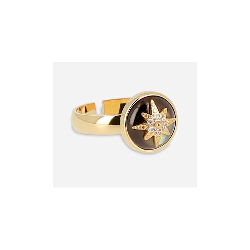 Bague ZAG BIJOUX en acier doré avec nacre grise et strass. Taille ajustable.