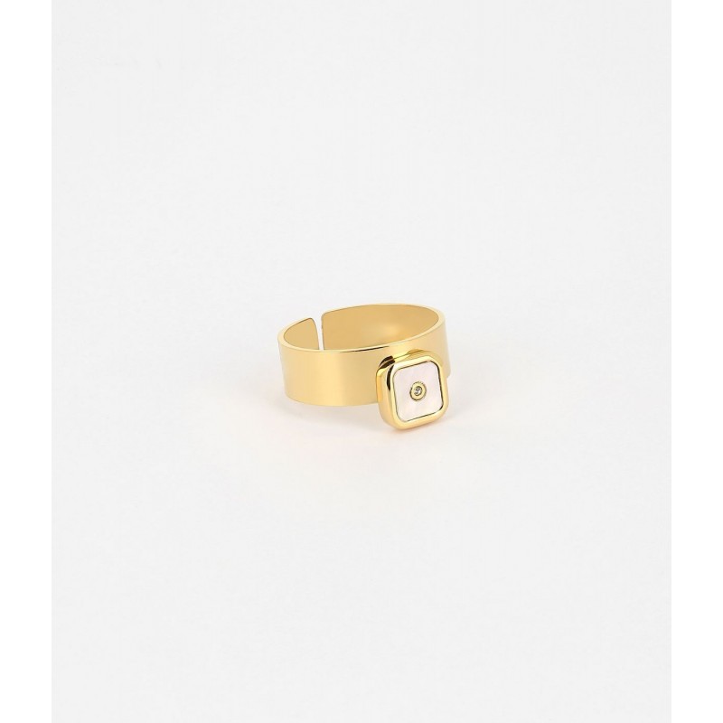 Bague ZAG BIJOUX en acier doré avec nacre et strass. Taille ajustable.