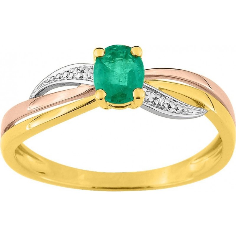 Bague en or 750/1000 tricolore (jaune, blanc et rose) serti d'une emeraude centrale et de diamants (0.006ct). Taille 54. Poids: 1.80g