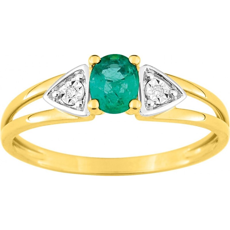 Bague en or 750/1000 jaune serti d'une emeraude centrale et de diamants pastillés (0.01ct) sur or blanc 750/1000. Taille 54. Poids: 1.80g