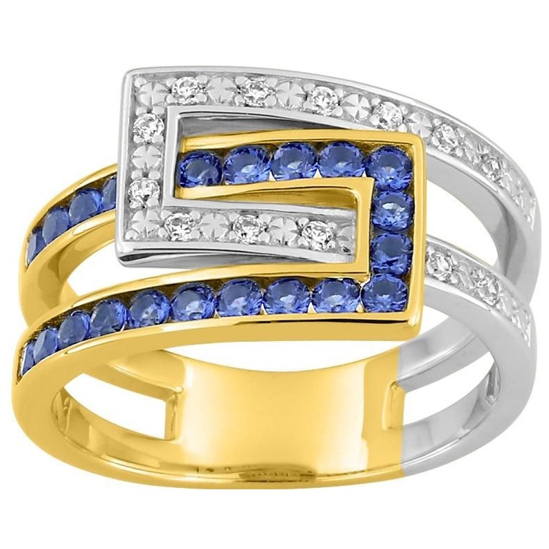 Bague en plaque or sertis d'oxydes de zirconium blancs et bleus. Taille 54.