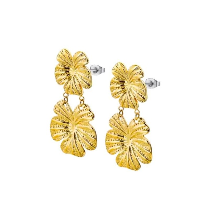 Boucles d'oreilles LOTUS en acier doré pendantes avec fleurs. Système belge (tige + poussette).