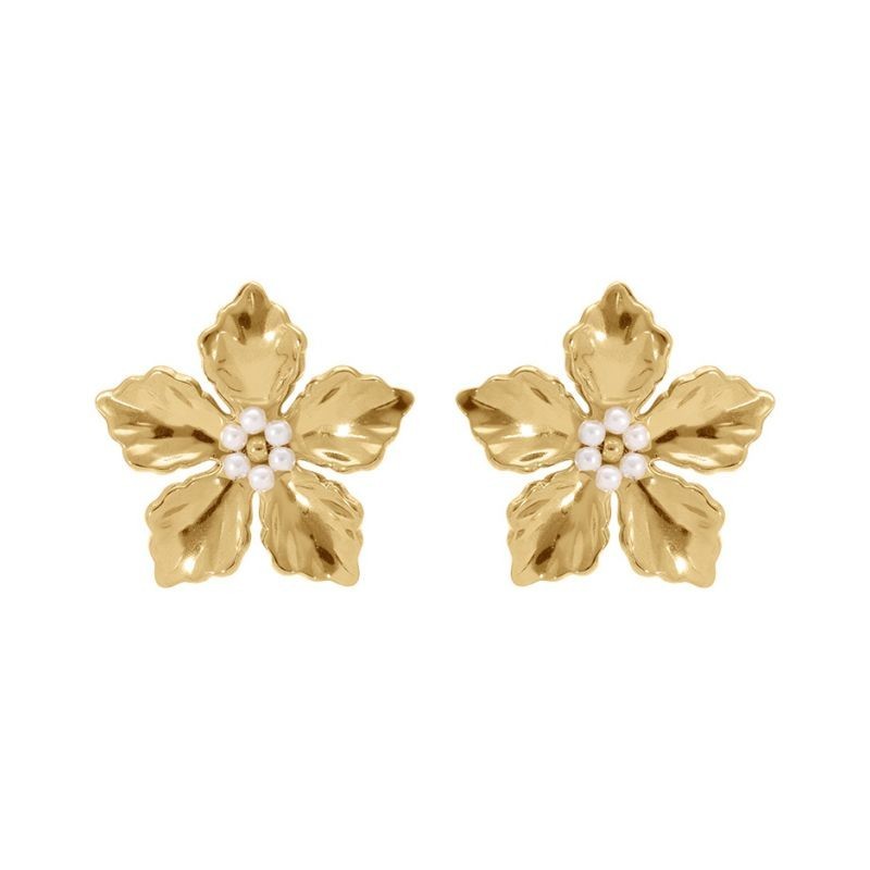Boucles d'oreilles en acier doré en forme de fleurs avec perles d'imitations. Système belge (tige + poussette).