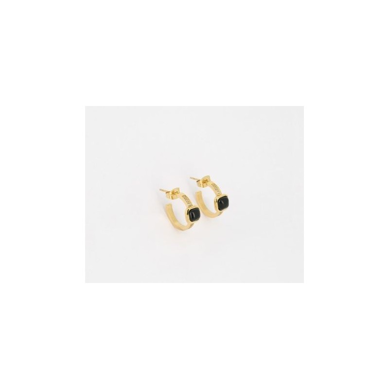 Boucles d'oreilles ZAG BIJOUX en acier doré avec strass et onyx. Système belge (tige + poussette).