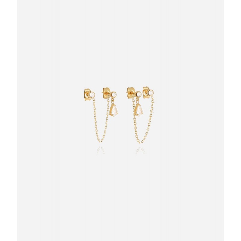Boucles d'oreilles ZAG BIJOUX en acier doré double avec strass. Système belge (tige + poussette).