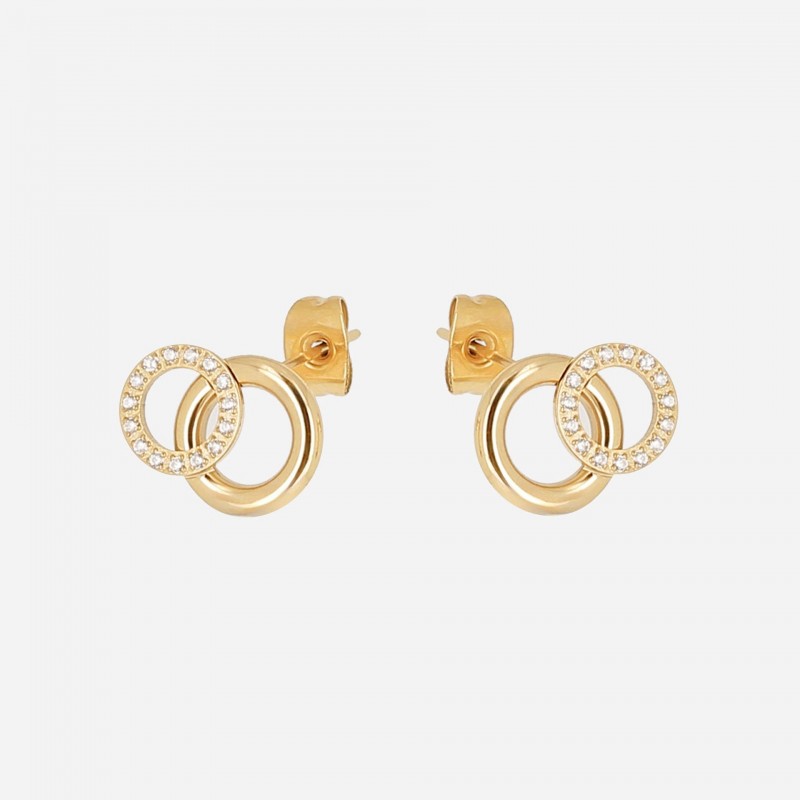 Boucles d'oreilles ZAG BIJOUX en acier doré avec strass. Système belge (tige + poussette).