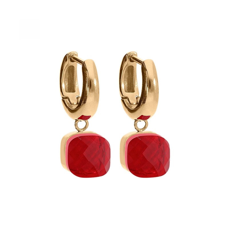 Boucles d'oreilles QUDO en acier doré créoles avec cristaux rouge. Système cliquet.