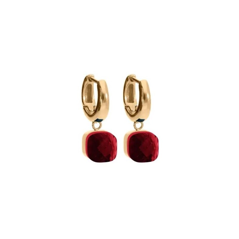 Boucles d'oreilles QUDO en acier doré créoles avec cristaux bordeaux. Système cliquet.
