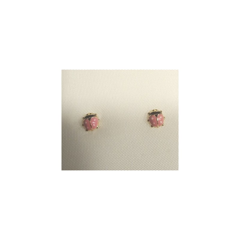 Boucles d'oreilles en or jaune 375/1000 en forme de coccinelles roses. Système vis (tige + poussette vis). Poids: 0.41g