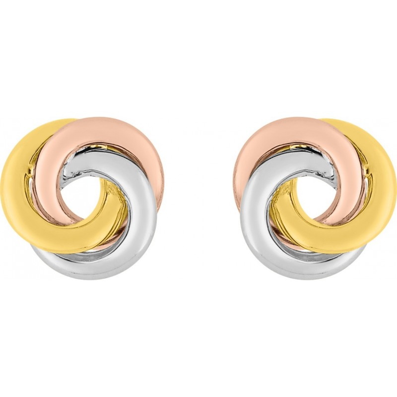 Boucles d'oreilles en or 375/1000 tricolore (jaune, blanc, rose) en forme d'anneaux enrelacés. Système belge (tige + poussette). Poids: 0.50g