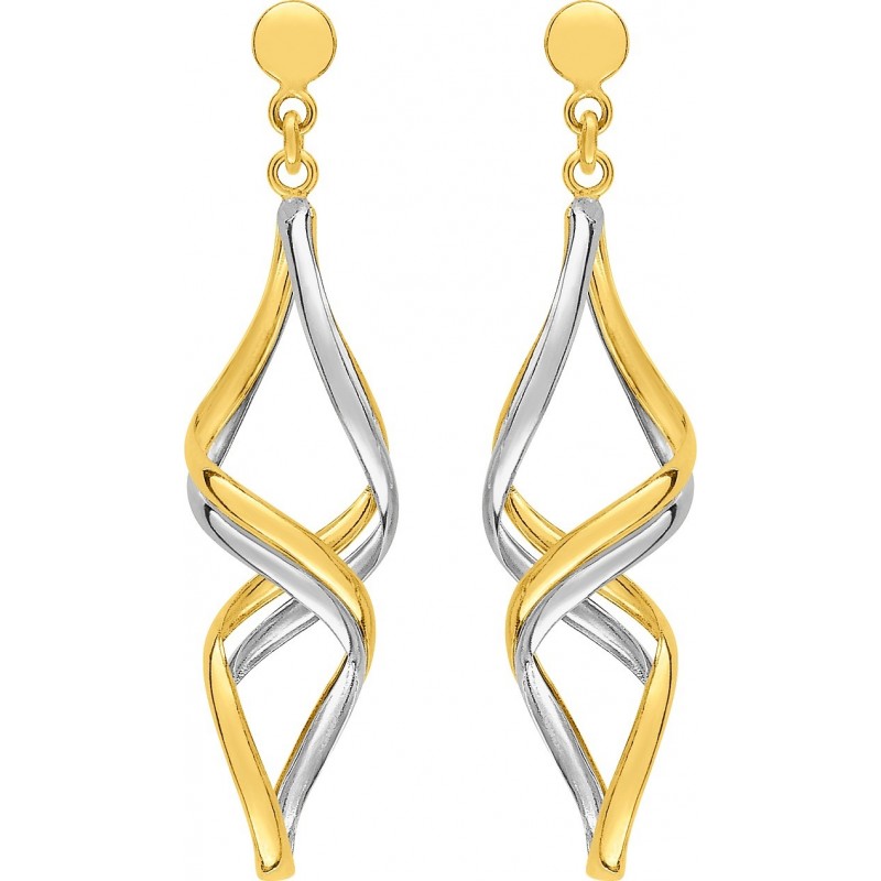 Boucles d'oreilles en or 375/1000 bicolore (jaune et blanc) pendantes. Système belge (tige + poussette). Poids: 1.15g