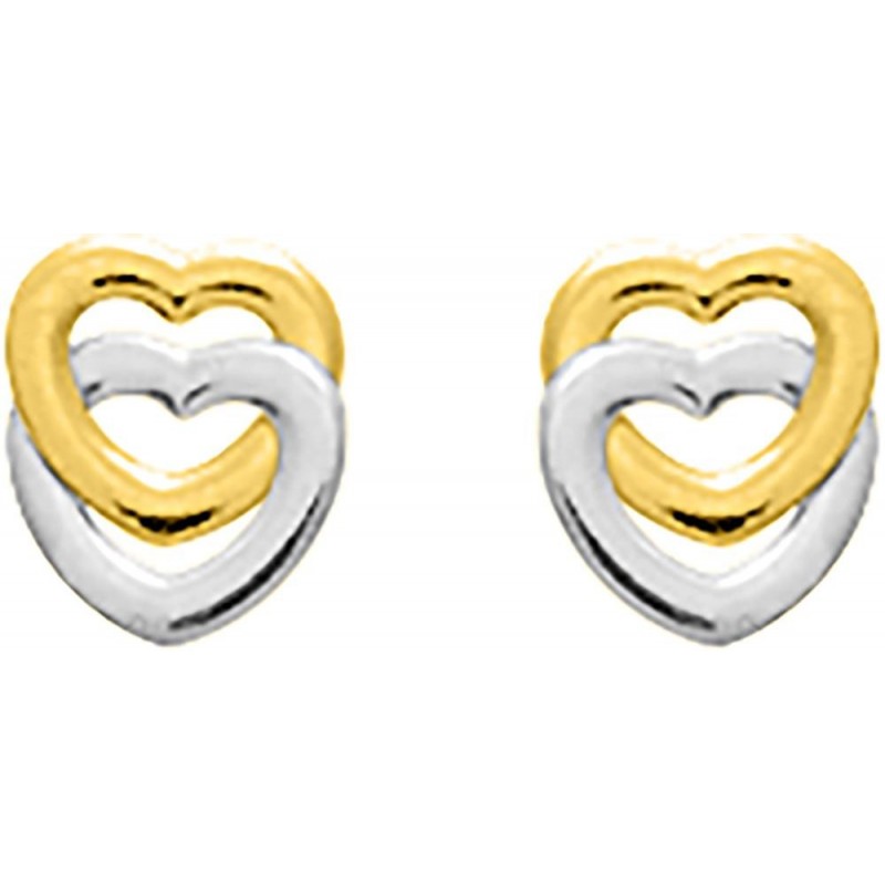 Boucles d'oreilles en or 375/1000 bicolore (jaune et blanc) en forme de coeurs. Système belge (tige + poussette). Poids: 0.25g