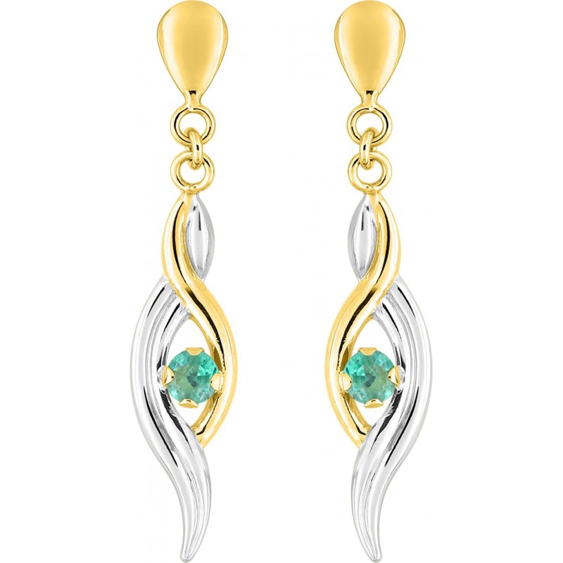 Boucles d'oreilles en or 375/1000 jaune pendantes sertis d'emeraudes. Système belge (tige + poussette). Poids: 0.55g