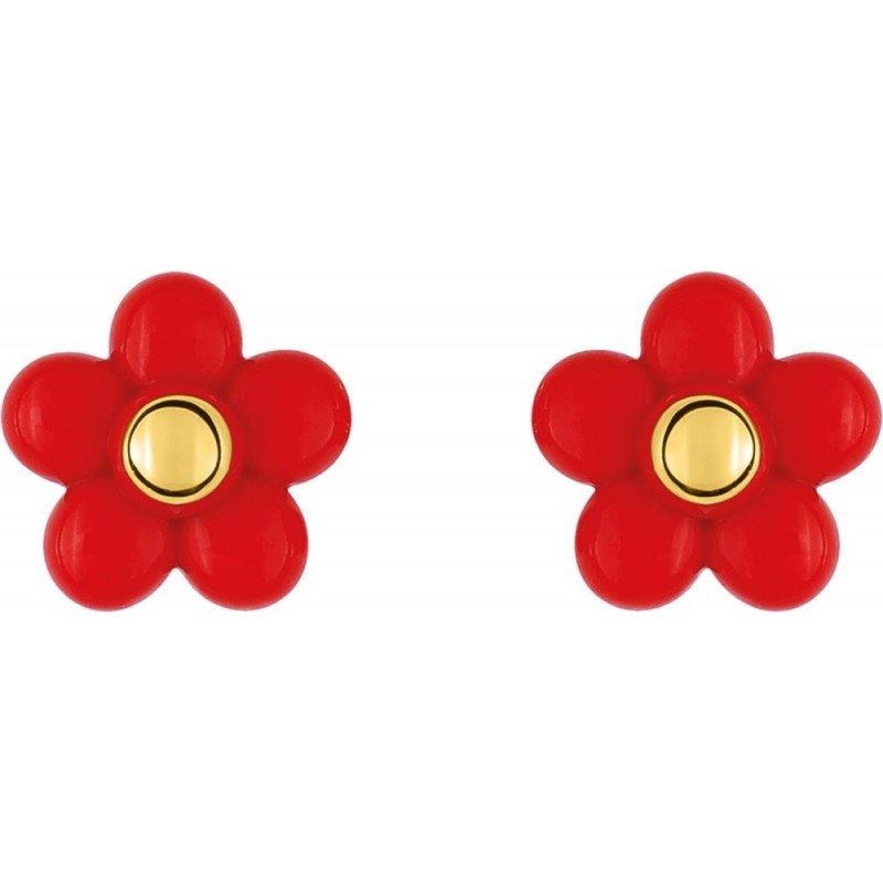 Boucles d'oreilles en or 375/1000 jaune motifs fleurs rouges. Système vis (tige + poussette vis). Poids: 0.25g