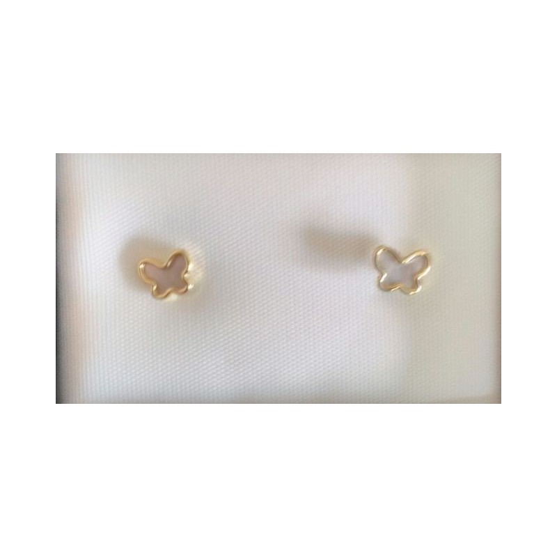 Boucles d'oreilles en or 375/1000 jaune en forme de papillons avec nacres. Système vis (tige + poussette vis). Poids: 0.32g