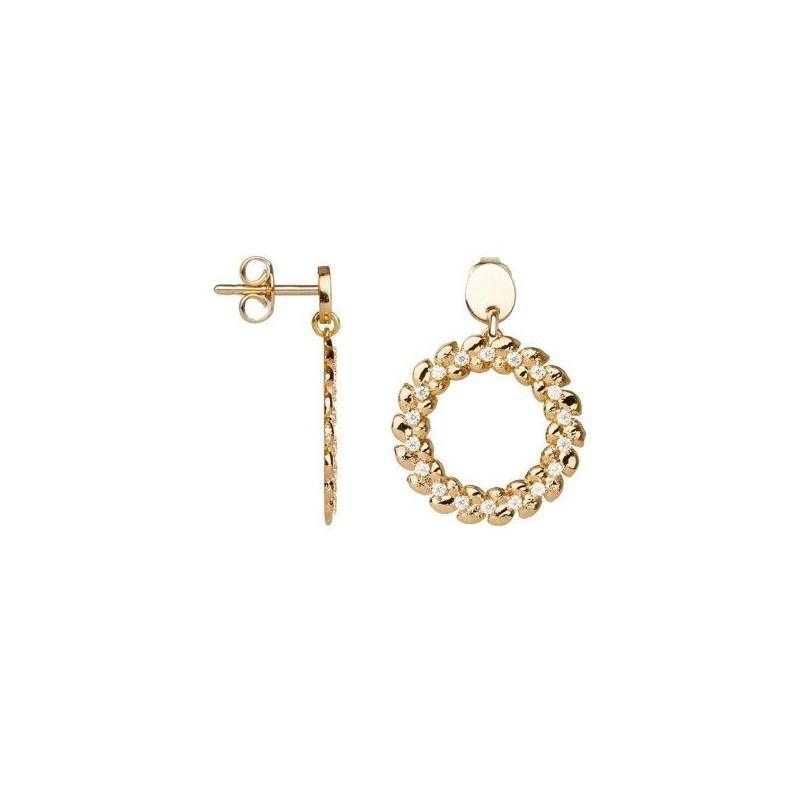 Boucles d'oreilles en plaque or pendantes sertis d'oxydes de zirconium. Système belge (tige + poussette).