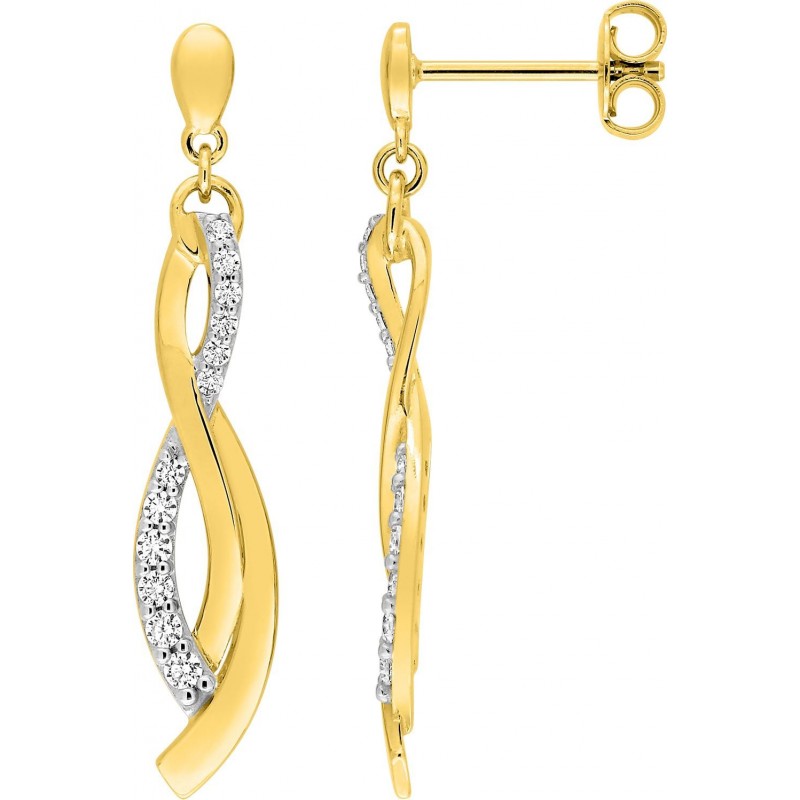 Boucles d'oreilles en plaque or pendantes serti d'oxydes de zirconium. Système belge (tige + poussette).