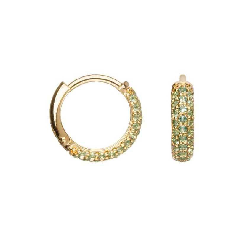 Boucles d'oreilles en plaque or créoles sertis d'oxydes de zirconium verts. Système cliquet.