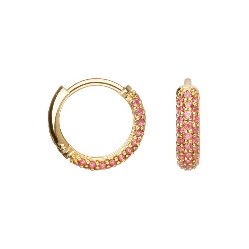 Boucles d'oreilles en plaque or créoles sertis d'oxydes de zirconium roses. Système cliquet.