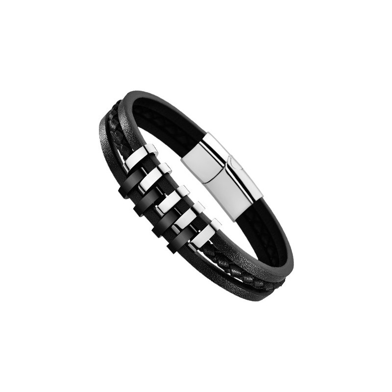Bracelet LOTUS en cuir noir et acier. Fermoir acier. Longueur 21cm.