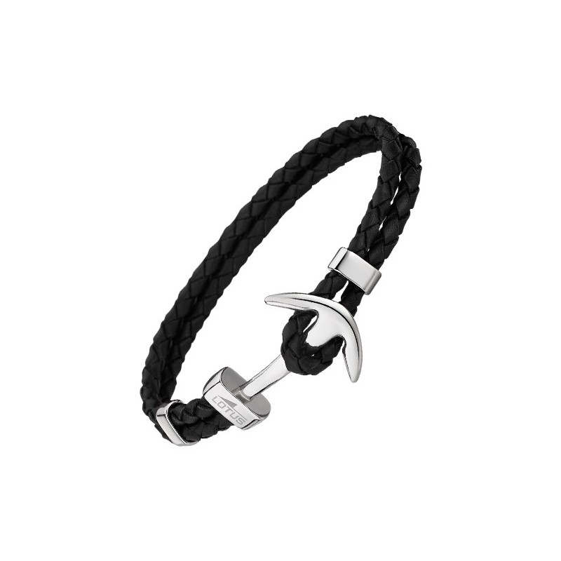 Bracelet LOTUS en cuir noir et ancre en acier. Longueur 21.5cm.