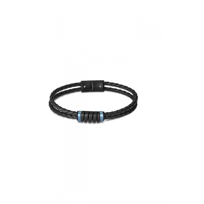 Bracelet LOTUS en cuir noir tressé et acier noir et bleu. Fermoir acier. Longueur 22cm.