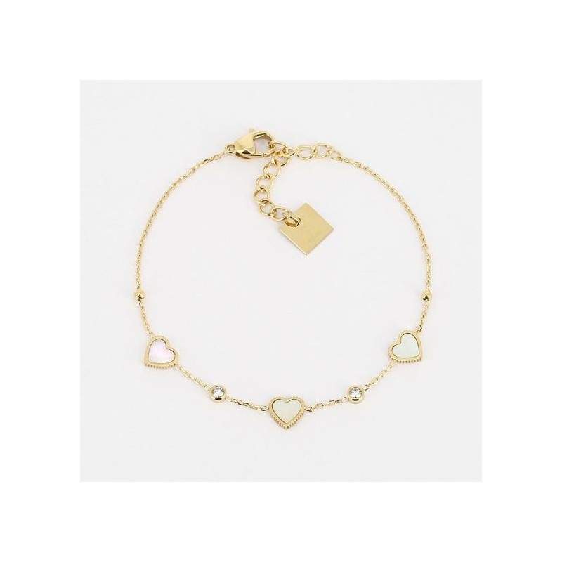 Bracelet ZAG BIJOUX en acier doré avec strass et coeur nacre. Fermoir mousqueton. Longueur ajustable de 15cm à 18cm.