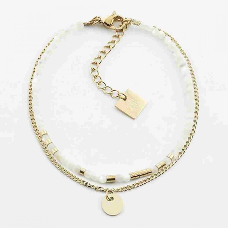 Bracelet ZAG BIJOUX en acier doré avec nacre. Fermoir mousqueton. Longueur ajustable de 15cm à 18cm.