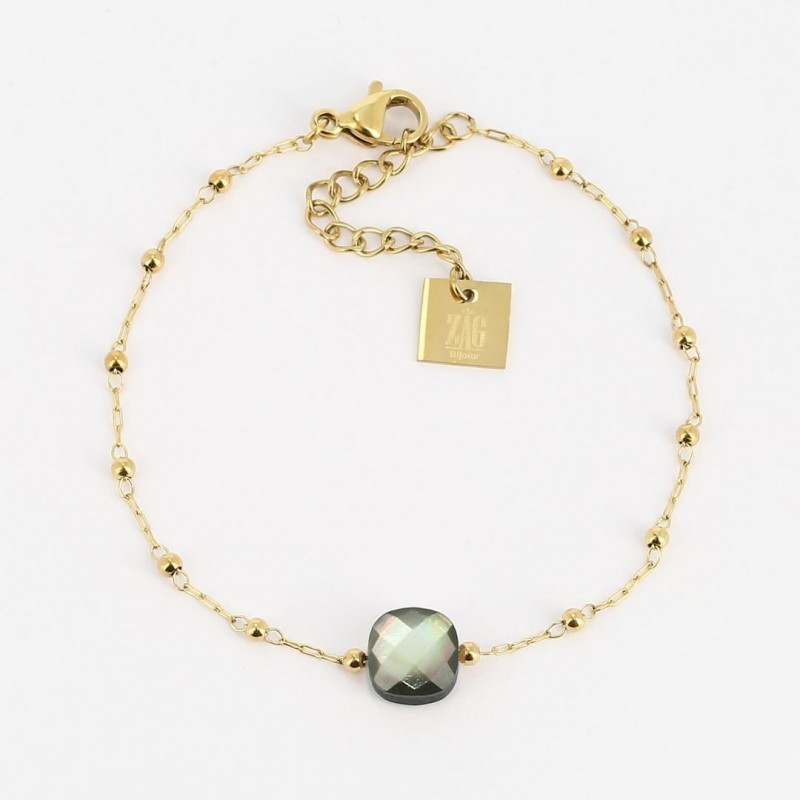Bracelet ZAG BIJOUX en acier doré avec nacre grise et petites boules. Fermoir mousqueton. Longueur ajustable de 15cm à 18cm.