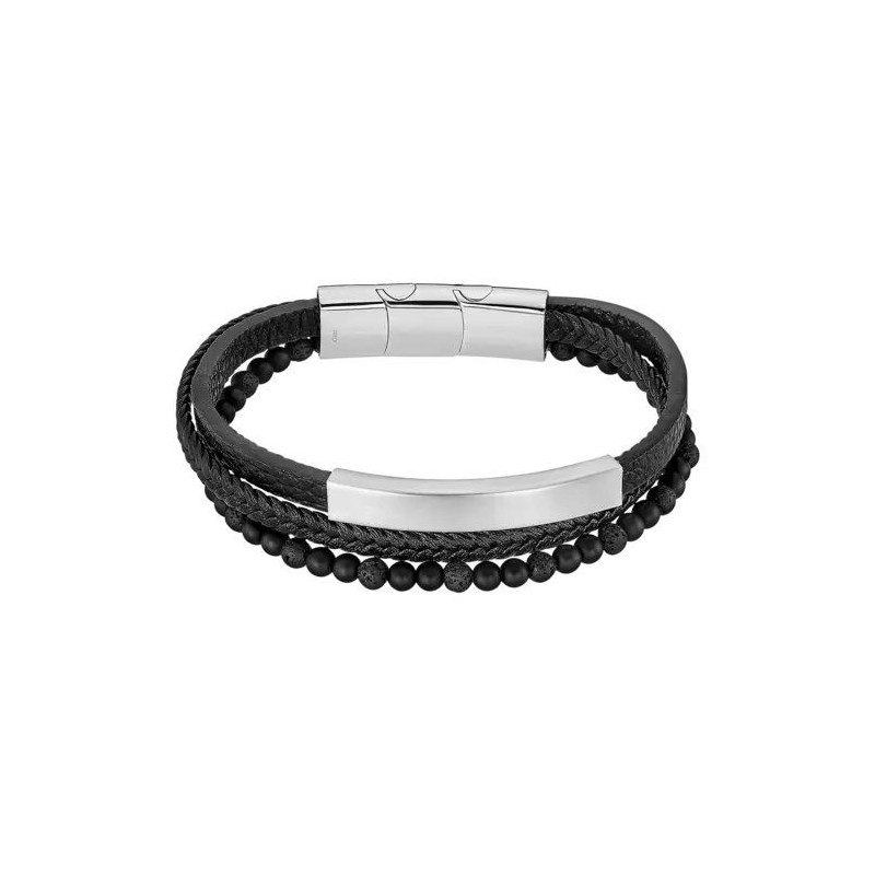 Bracelet LOTUS en cuir noir et acier. Fermoir aimanté. Longueur ajustable à 20cm et 21cm.