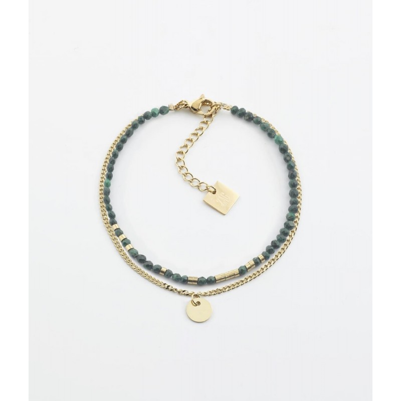 Bracelet ZAG BIJOUX en acier doré avec perles malachite. Fermoir mousqueton. Longueur ajustable de 15cm à 18cm.
