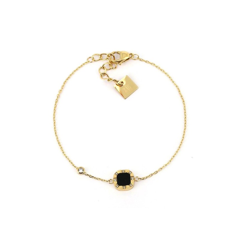 Bracelet ZAG BIJOUX en acier doré avec onyx et strass. Fermoir mousqueton. Longueur ajustable de 15cm à 18cm.