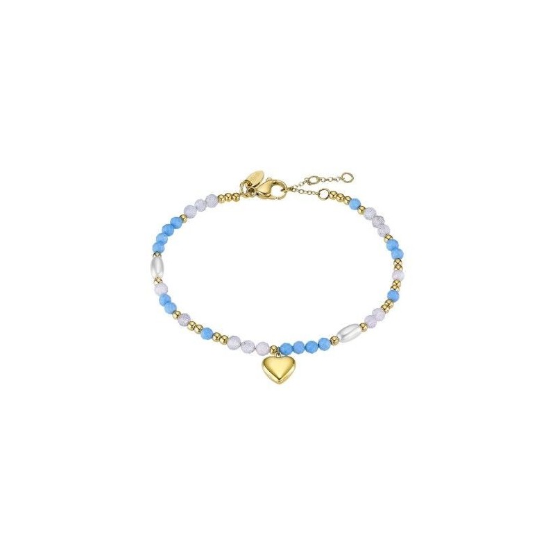 Bracelet LOTUS en acier doré avec perles multicolores et pampille coeur. Fermoir mousqueton. Longueur ajustable de 17cm à 20cm.