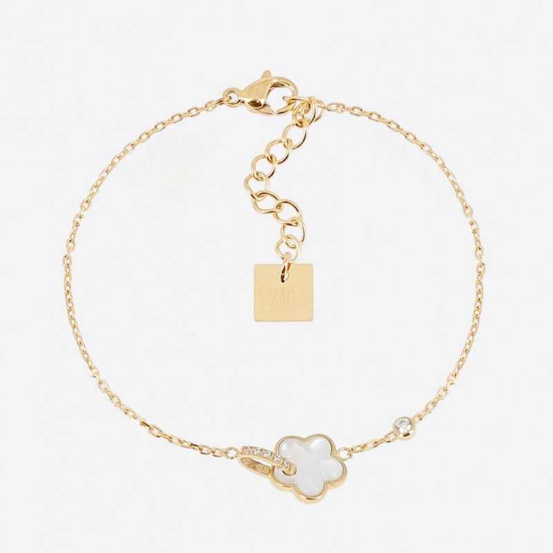 Bracelet ZAG BIJOUX en acier doré avec nacre et strass. Fermoir mousqueton. Longueur ajustable de 15cm à 18cm.