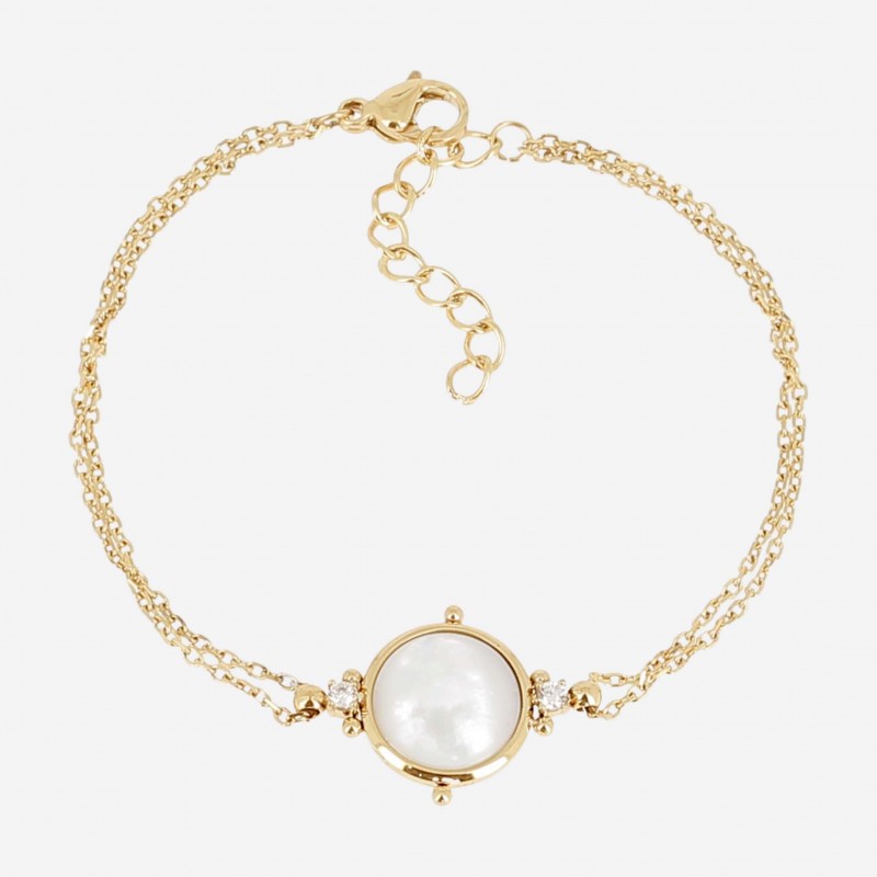 Bracelet ZAG BIJOUX en acier doré avec nacre et strass. Fermoir mousqueton. Longueur ajustable de 15cm à 18cm.