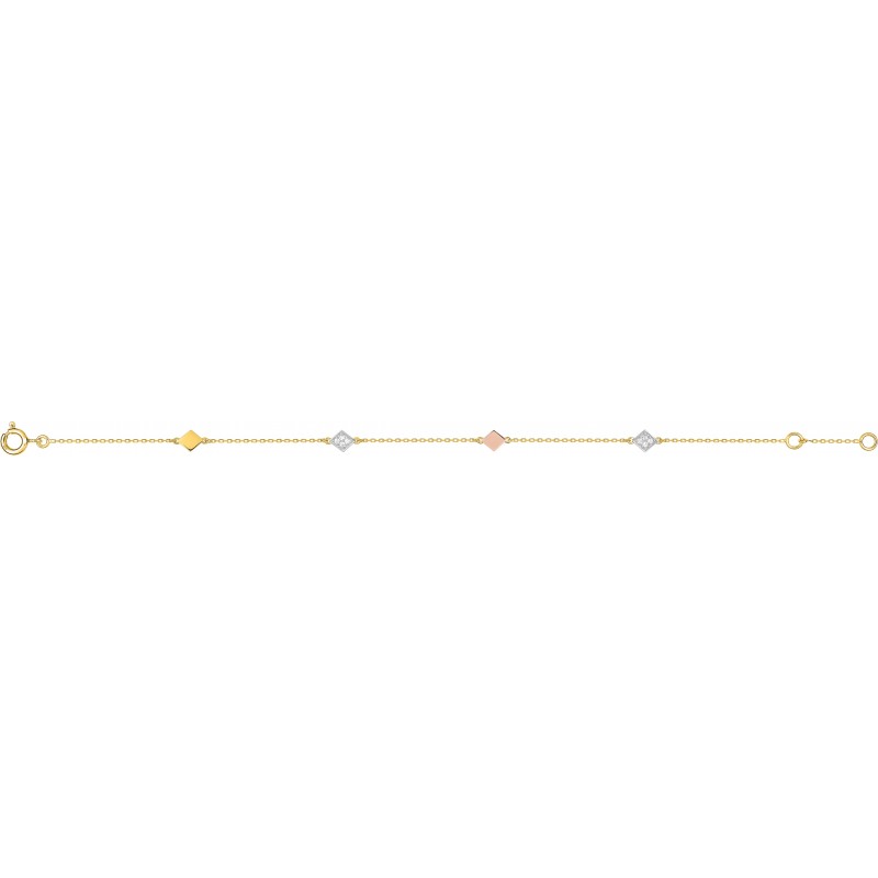 Bracelet en or 375/1000 jaune avec motifs trois couleurs (blanc, jaune et rose) sertis de diamants (0.01ct). Fermoir anneau ressort. Longueur 18cm. Poids: 0.85g.
