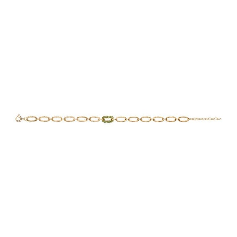Bracelet en plaque or sertis d'oxydes de zirconium verts. Fermoir anneau ressort. Longueur ajustable de 18cm à 20cm.
