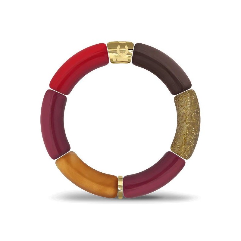 Bracelet ICE WATCH en acrylique rouge, bordeaux et marron et acier doré sur fil élastique. Longueur 18cm.