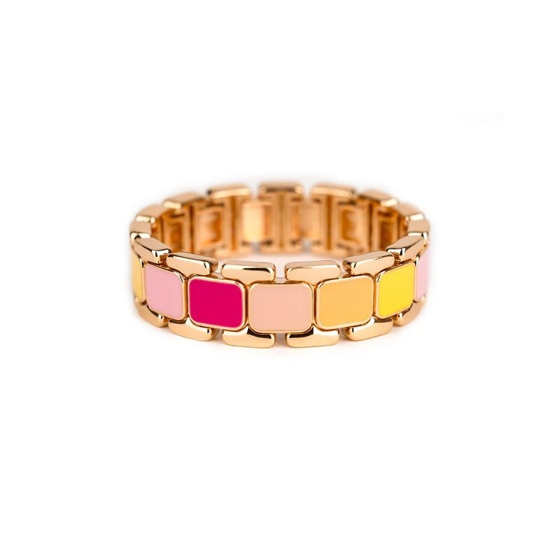 Bracelet SIMONE A BORDEAUX en métal émaillé rose, orange et jaune sur fil élastique. Longueur 18cm.