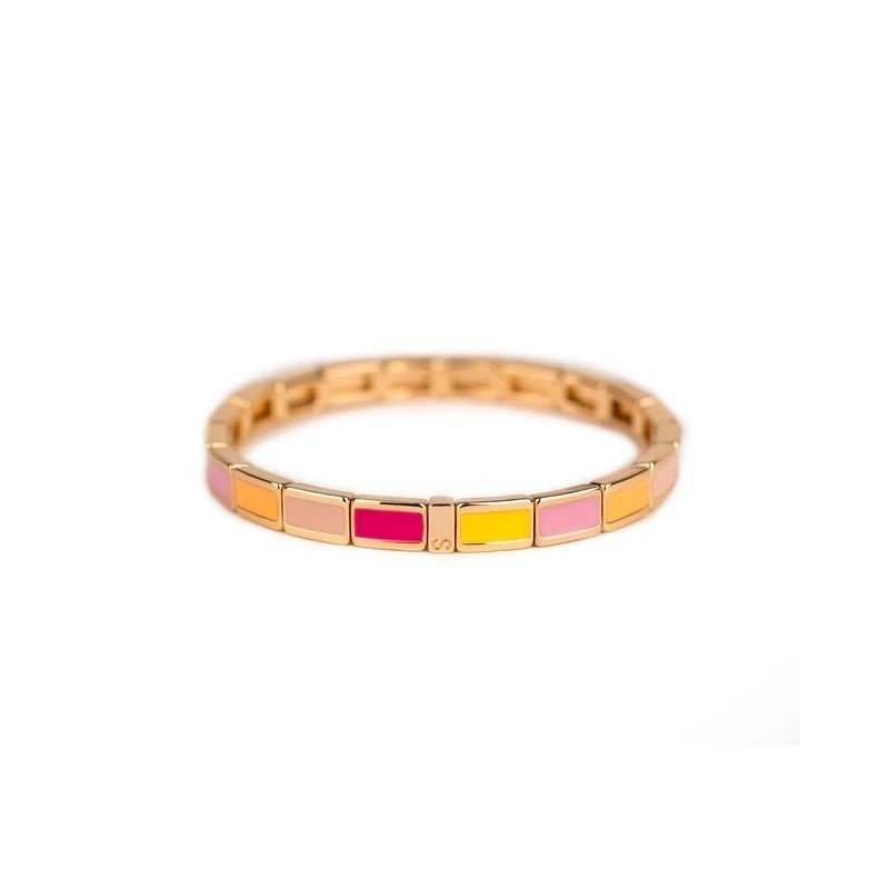 Bracelet SIMONE A BORDEAUX en métal émaillé rose, orange et jaune sur fil élastique. Longueur 18cm.