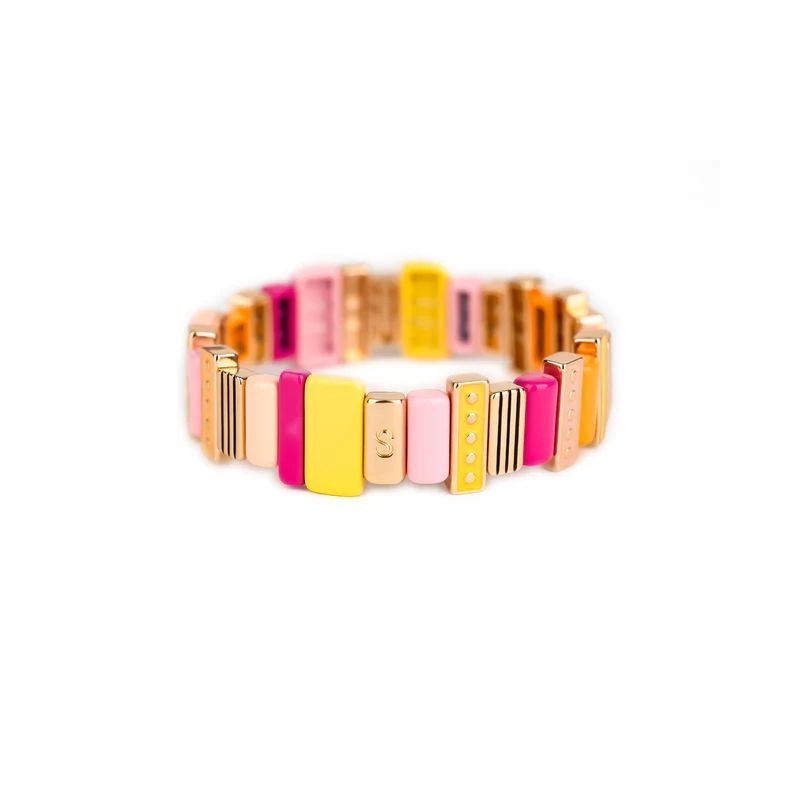Bracelet SIMONE A BORDEAUX en métal émaillé rose, orange et jaune sur fil élastique. Longueur 18cm.
