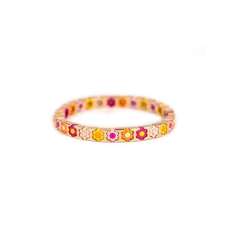Bracelet SIMONE A BORDEAUX en métal émaillé rose, orange et jaune sur fil élastique. Longueur 18cm.
