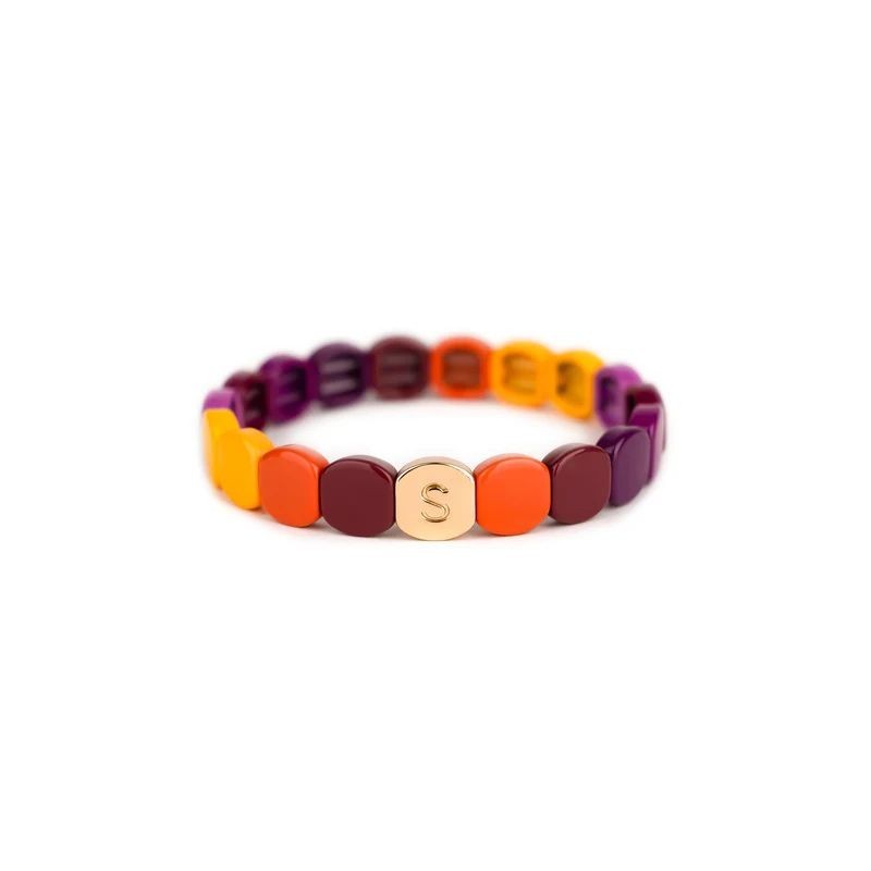 Bracelet SIMONE A BORDEAUX en métal émaillé violet, jaune et orange sur fil élastique. Longueur 18cm.
