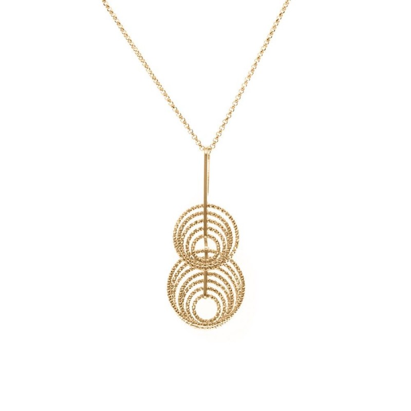 Collier ORUS, en argent 925/1000 et plaque or avec pendentif pendant de cercles de différentes tailles sur chaine maille jaseron. Fermoir mousqueton. Longueur ajustable de 40cm à 45cm. Poids: 6.06g