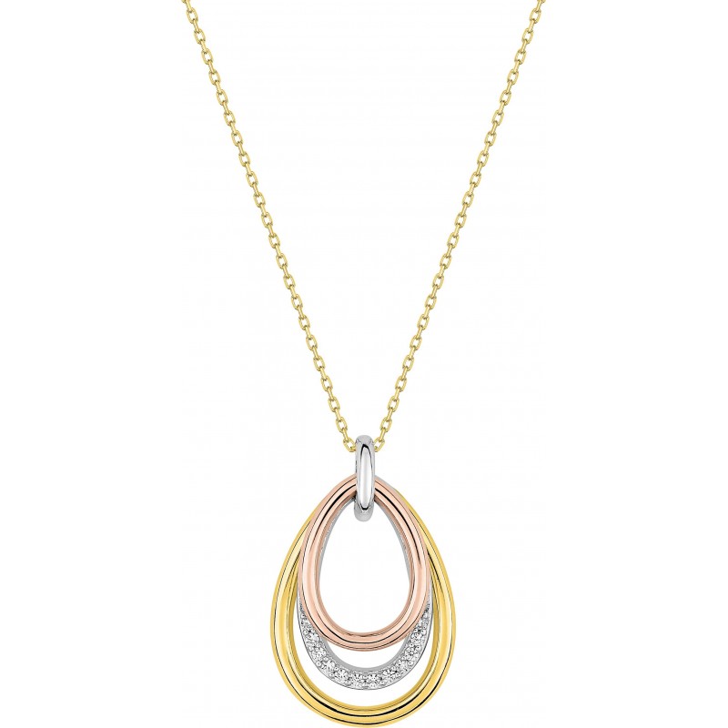 Collier en or 375/1000 jaune avec pendentif serti d'oxydes de zirconium en forme de gouttes tricolores (jaune, blanc, rose) sur chaine maille forçat. Fermoir anneau ressort. Longueur 42cm. Poids: 2.45g
