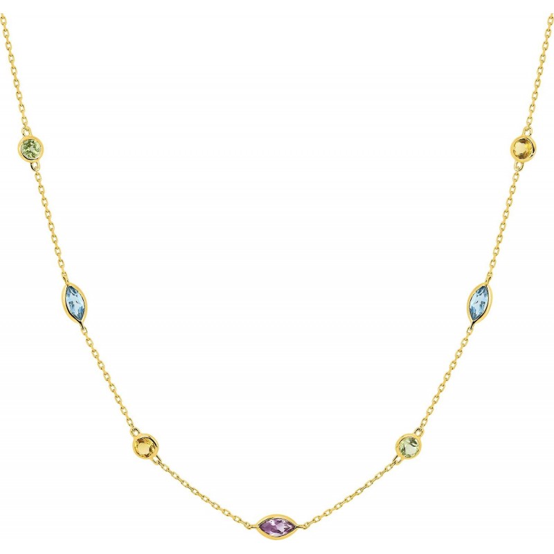 Collier en or 375/1000 jaune sertis de topazes et améthystes sur chaine maille forçat. Fermoir anneau ressort. Longueur 45cm. Poids: 1.20g