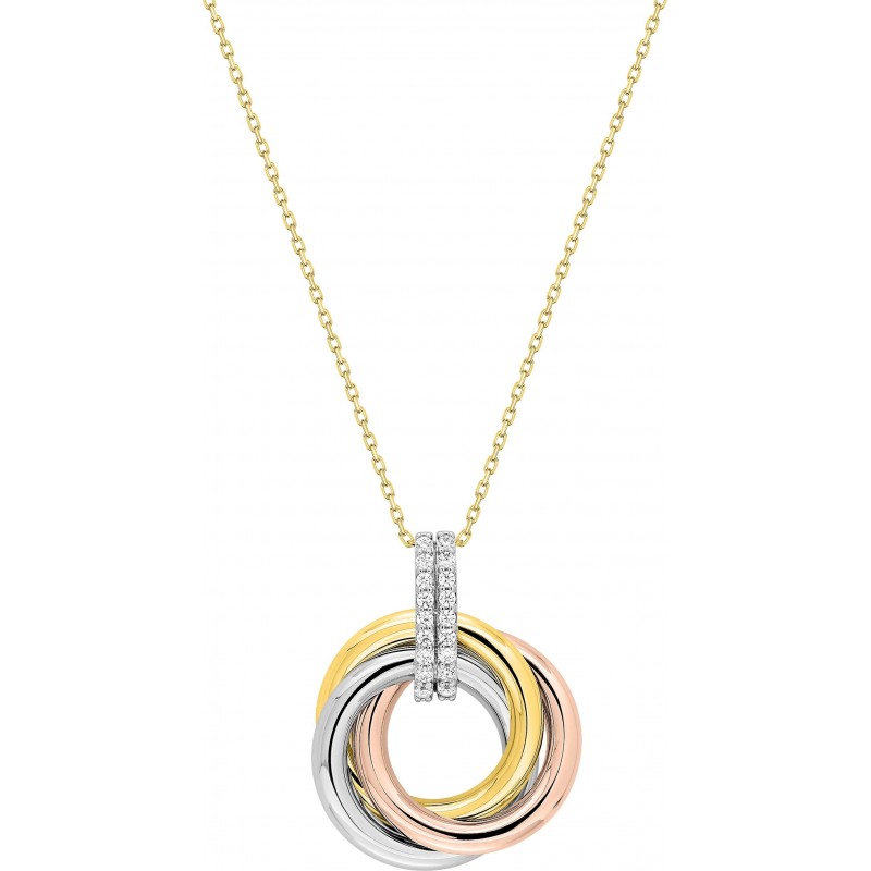 Collier en or 375/1000 jaune avec pendentif serti d'oxydes de zirconium et anneaux tricolores (jaune, blanc, rose) sur chaine maille forçat. Fermoir anneau ressort. Longueur 42cm. Poids: 1.75g