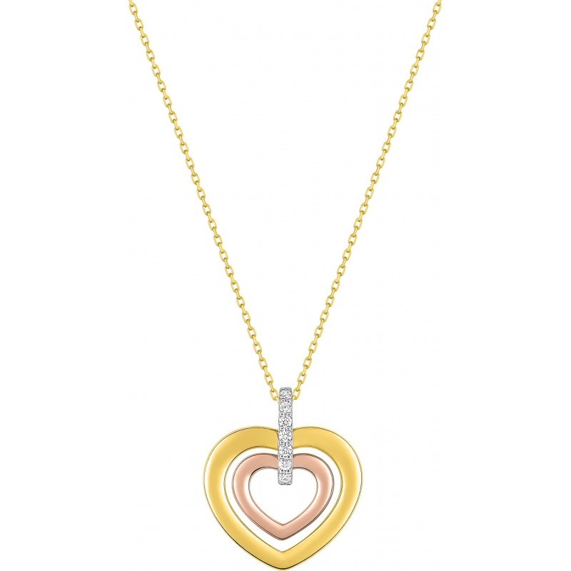 Collier en or 375/1000 jaune avec pendentif coeur tricolore (blanc, jaune et rose) sertis d'oxydes de zirconium sur chaine maille forçat. Fermoir anneau ressort. Longueur ajustable de 40cm à 45cm. Poids: 1.25g
