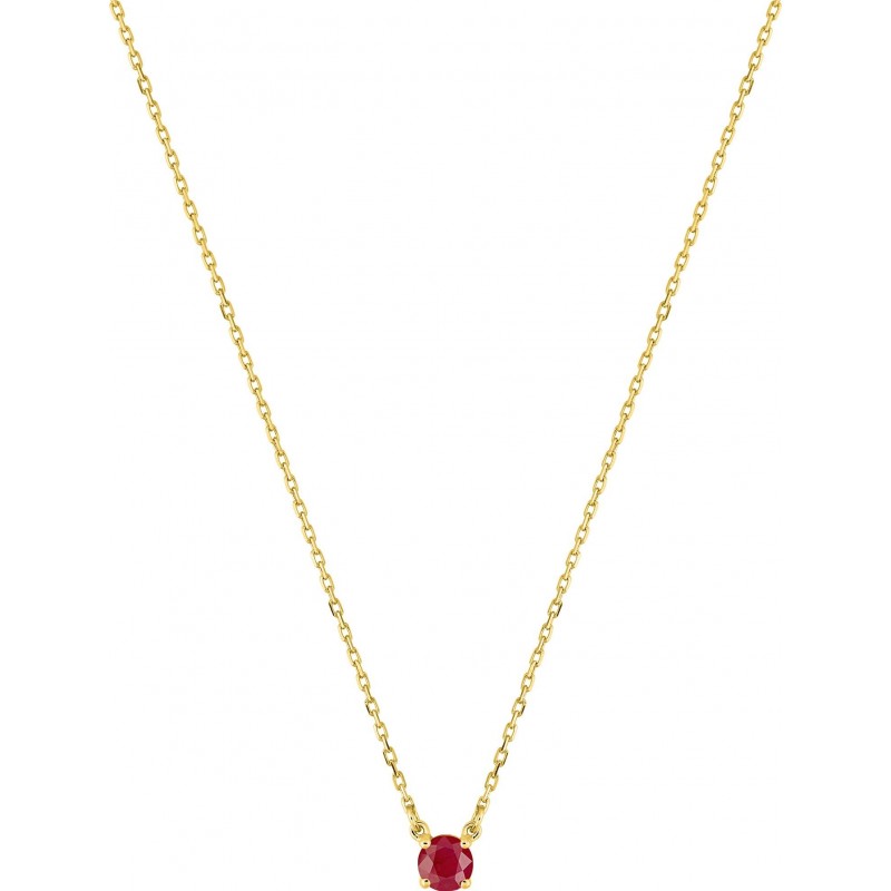 Collier en or 375/1000 jaune avec pendentif sertis d'un rubis sur chaine maille forçat. Fermoir anneau ressort. Longueur ajustable de 40cm à 45cm. Poids: 1.05g