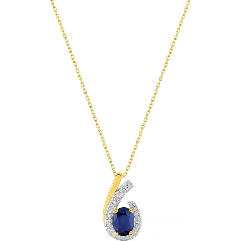 Collier en or 375/1000 jaune avec pendentif serti d'un saphir et de diamants (0.012ct) sur chaine maille forçat. Fermoir anneau ressort. Longueur ajustable de 40cm à 42cm. Poids: 1.60g